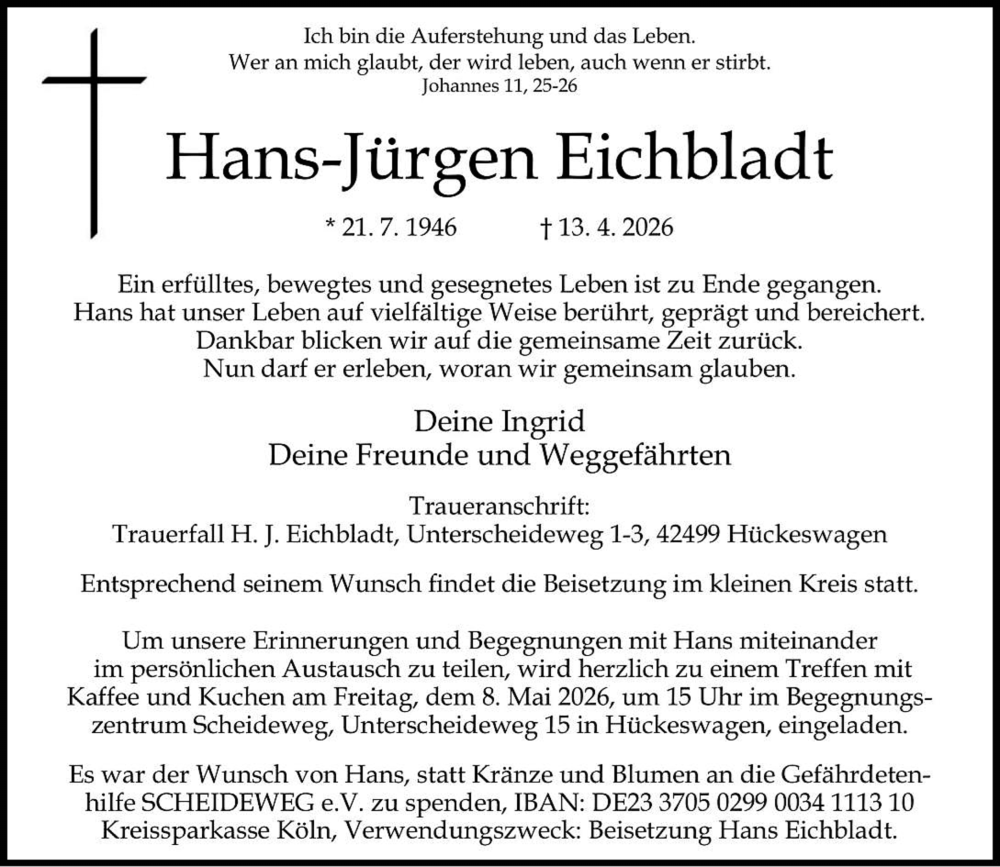 Am 13. April ist Hans-Jürgen Eichbladt im Alter von 79 Jahren nach langer, schwerer Krankheit zu seinem Herrn im Himmel gegangen. Mit seiner Frau Ingrid und seiner Familie trauern wir um einen Menschen, der die Gefährdetenhilfe SCHEIDEWEG seit ihren Anfängen auf ganz besondere Weise geprägt hat. Mit Hans verlieren wir nicht nur einen engagierten Mitstreiter, sondern einen Menschen, der mit seinem Glauben, seiner Hingabe und seiner Persönlichkeit viele von uns tief berührt hat.